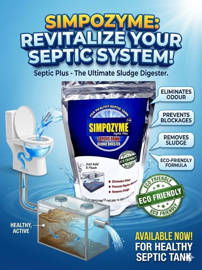 Simpozyme Septic Plus is a product containing bacteria and enzymes that help digest organic waste and eliminate odours in septic tanks.